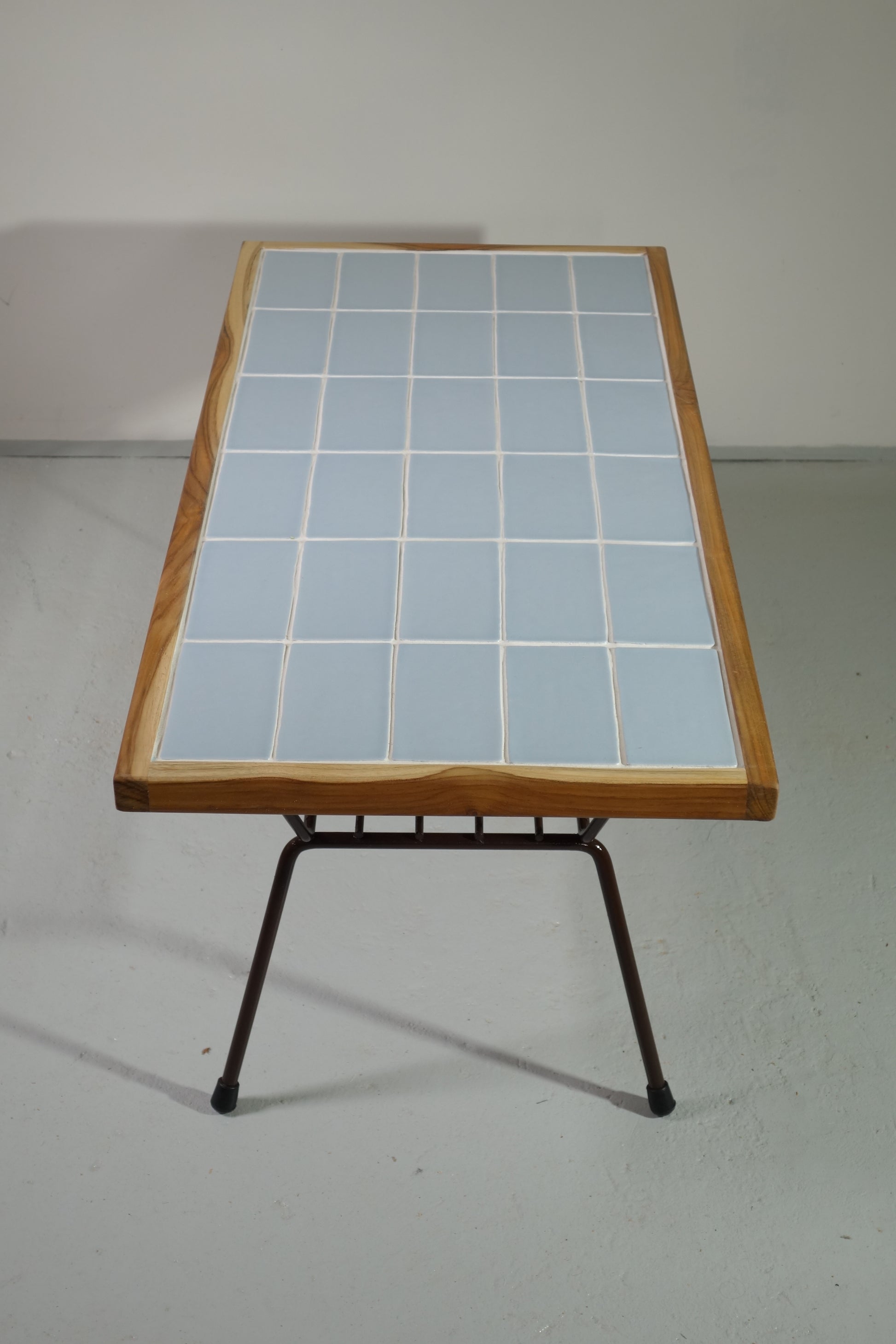 A beautiful mid-century upgrade. Made with pale blue ceramic tiles and recycled teak.