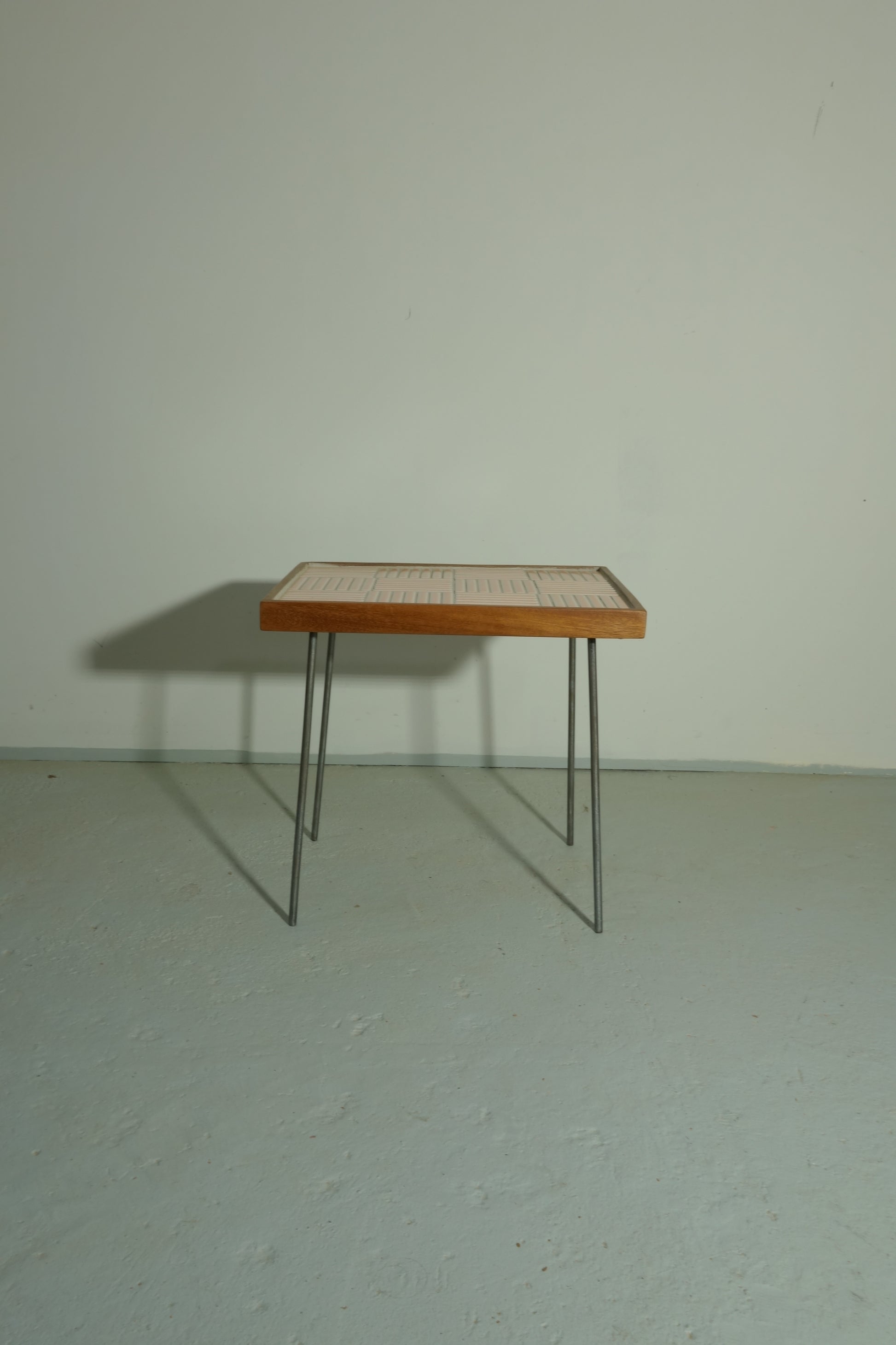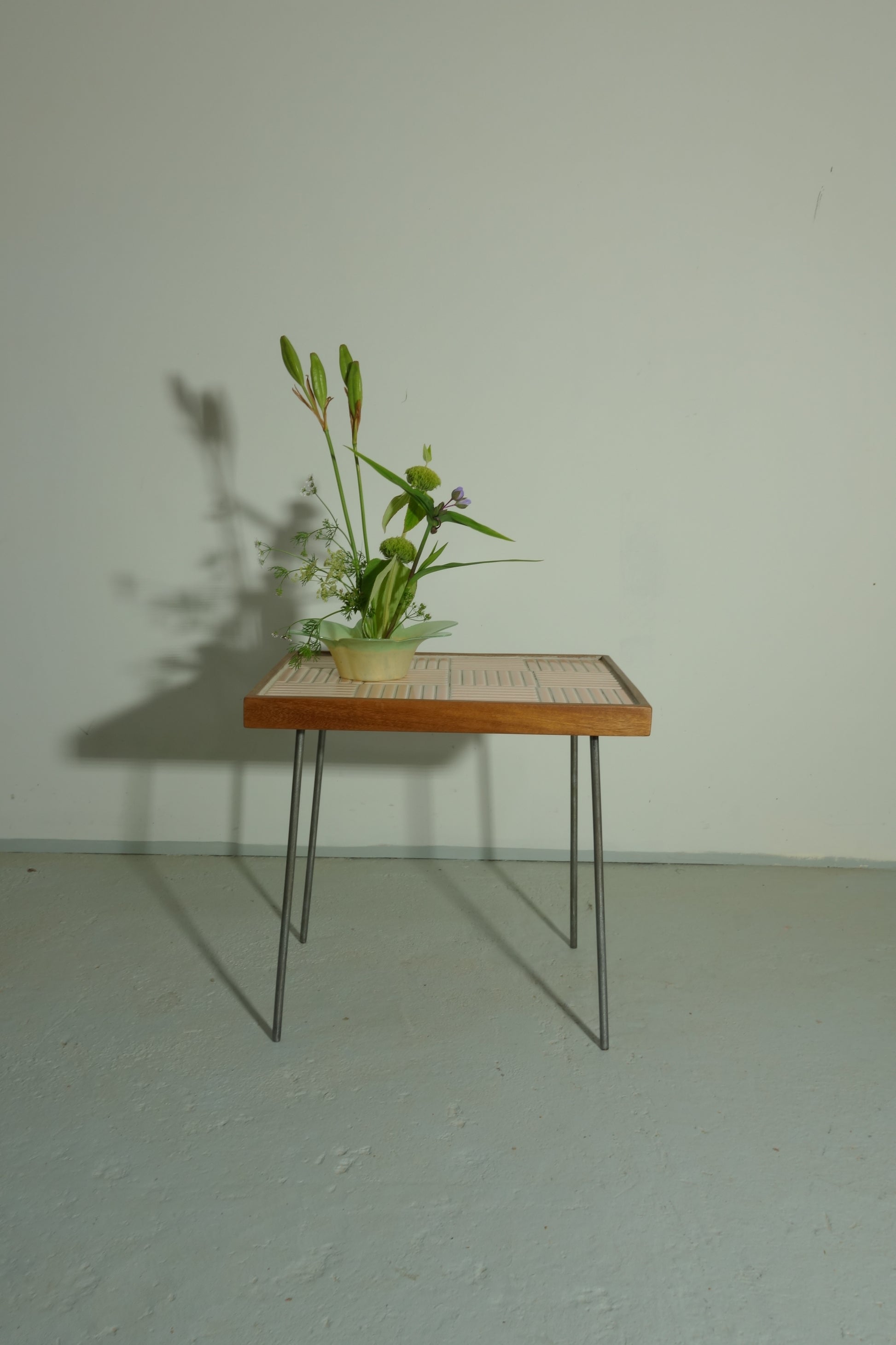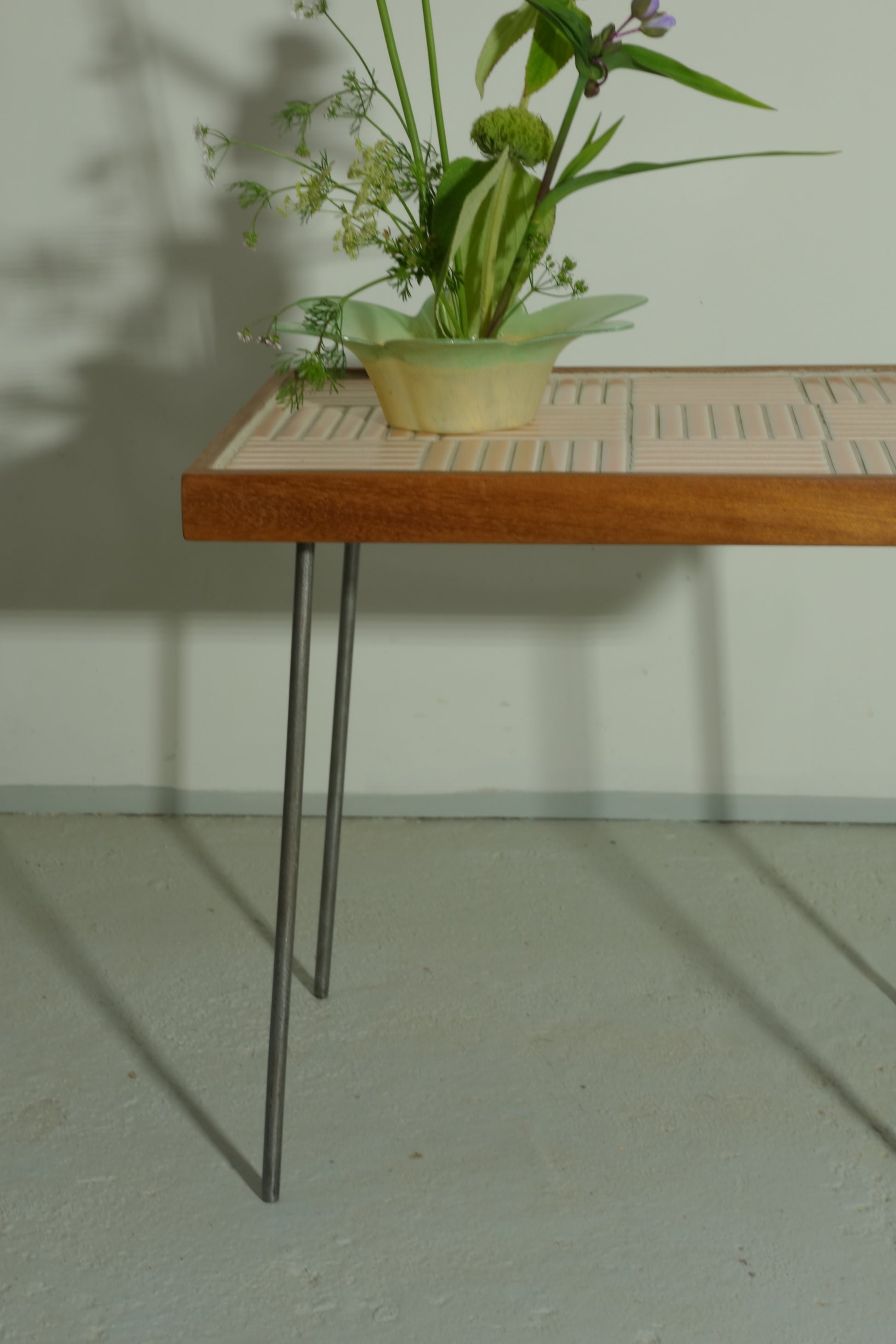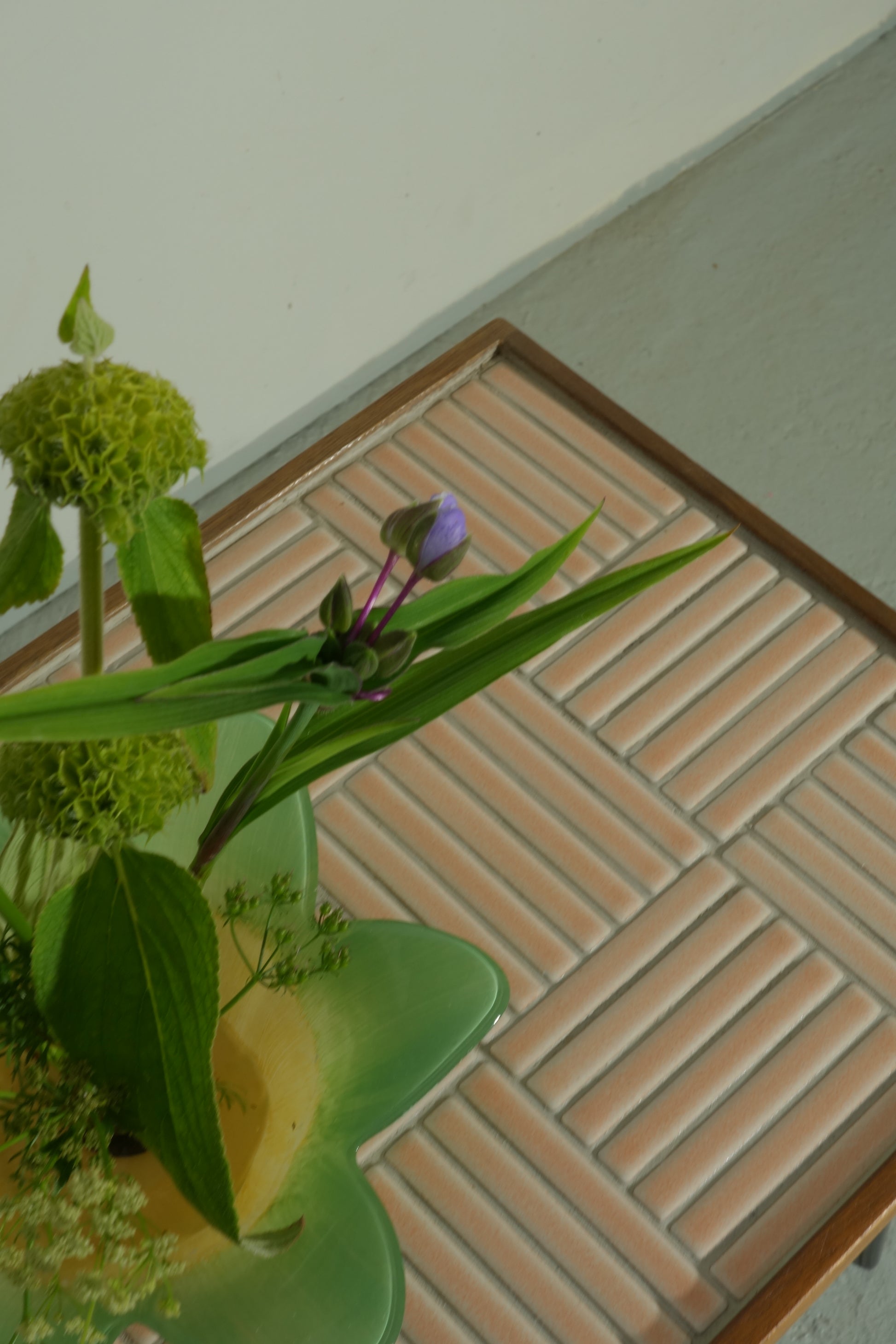 Beautiful pale pink tiles & subtle grey grout placed on slim metal legs. The timber trim is made from old salvaged mahogany.