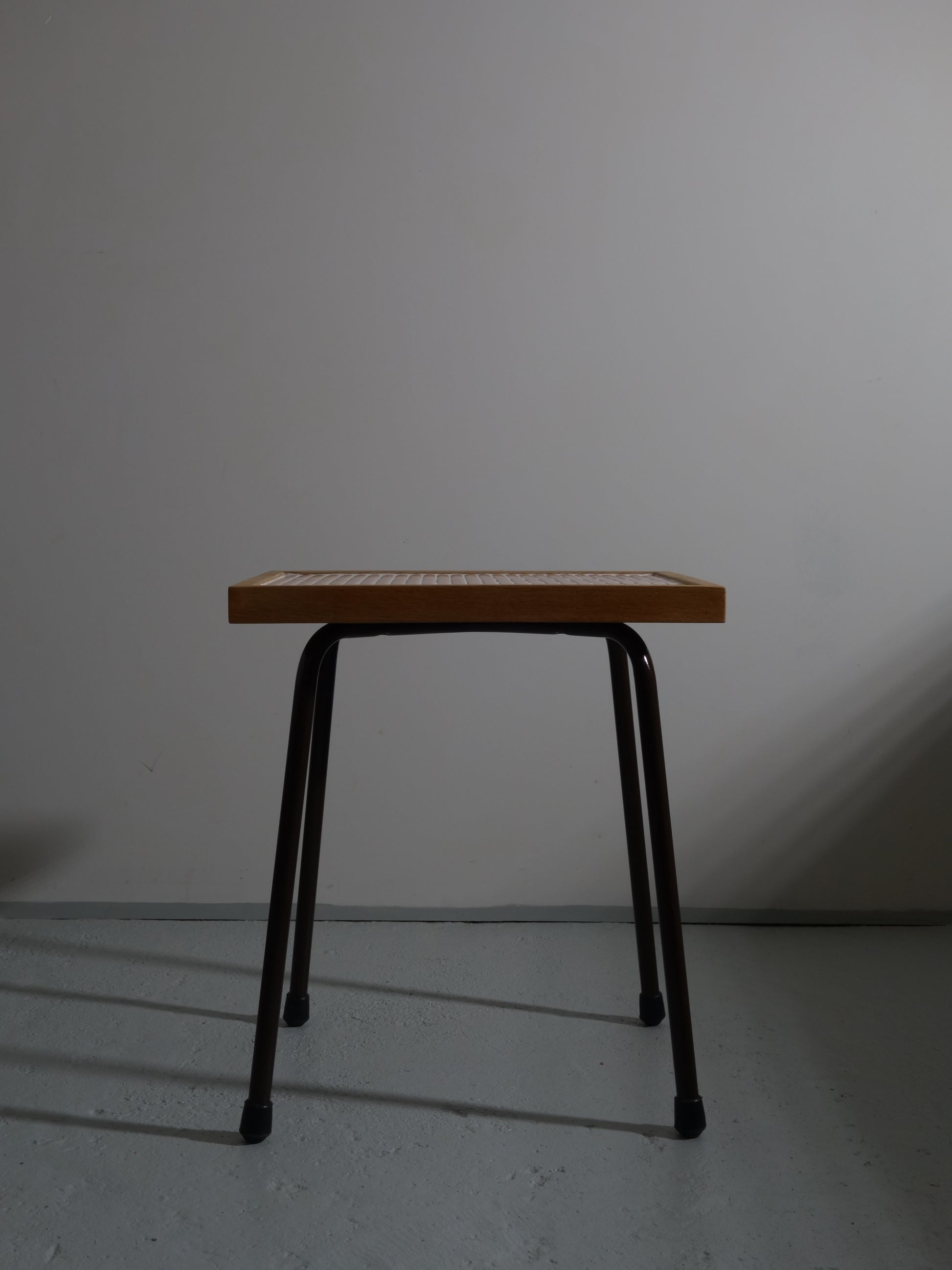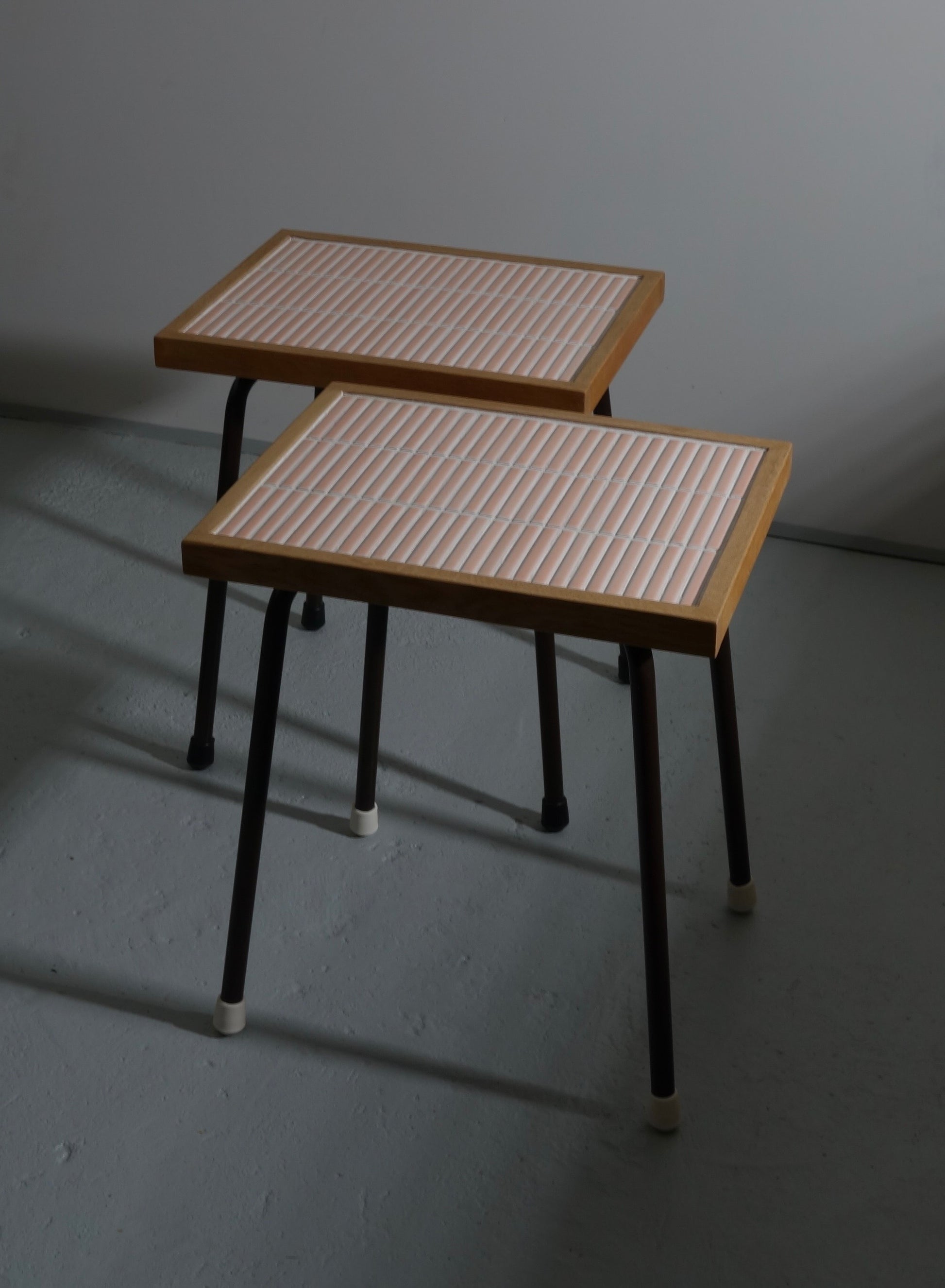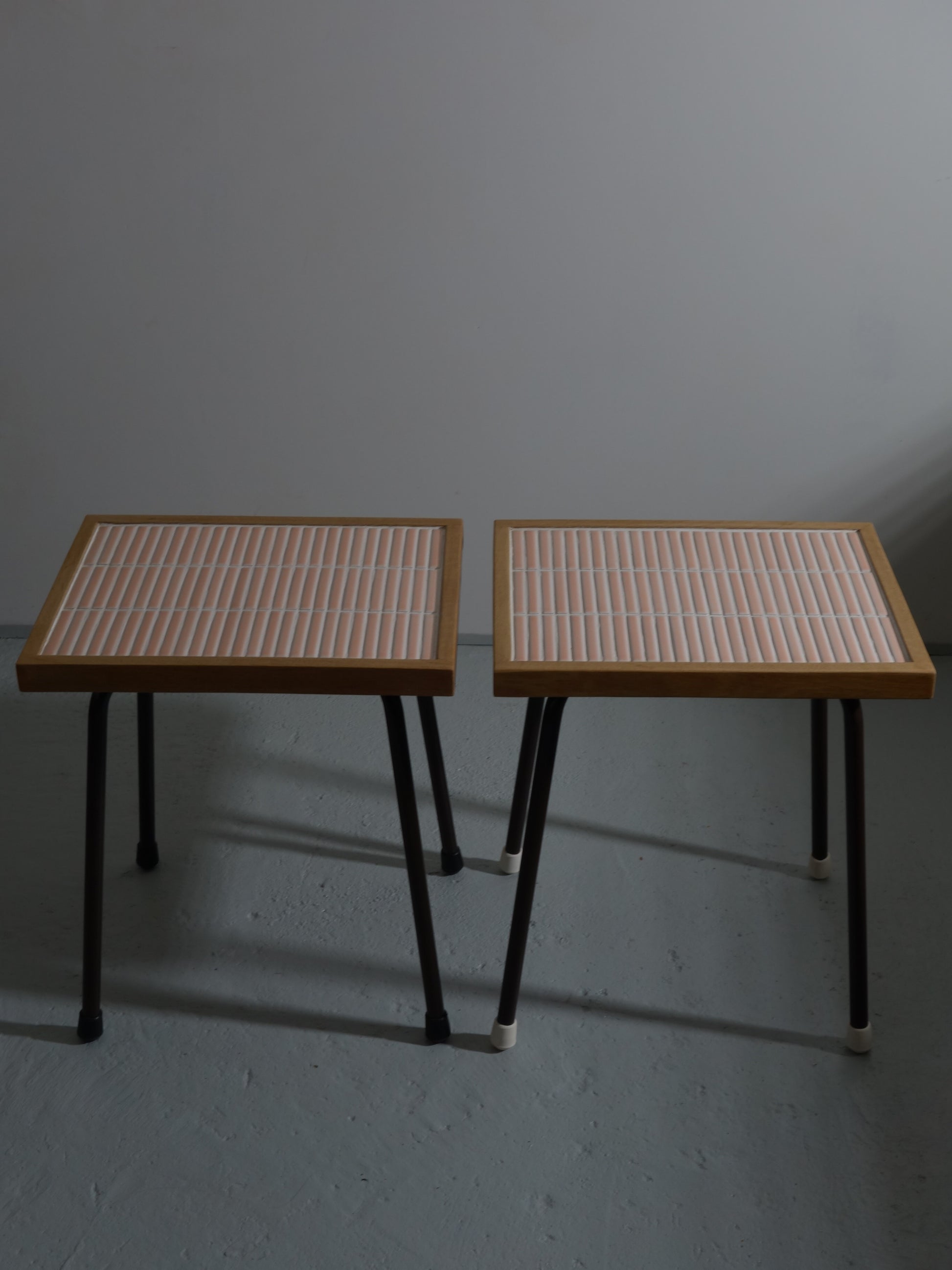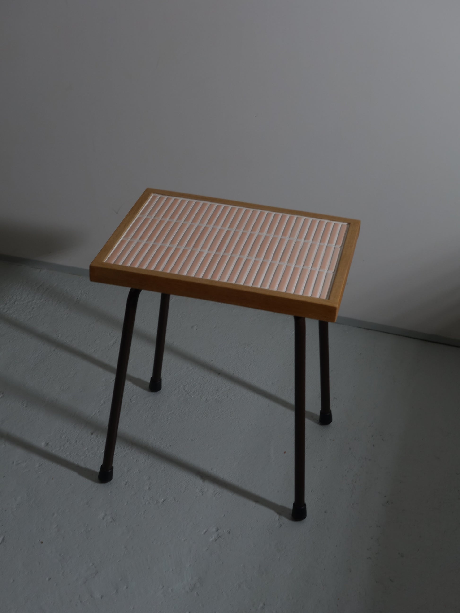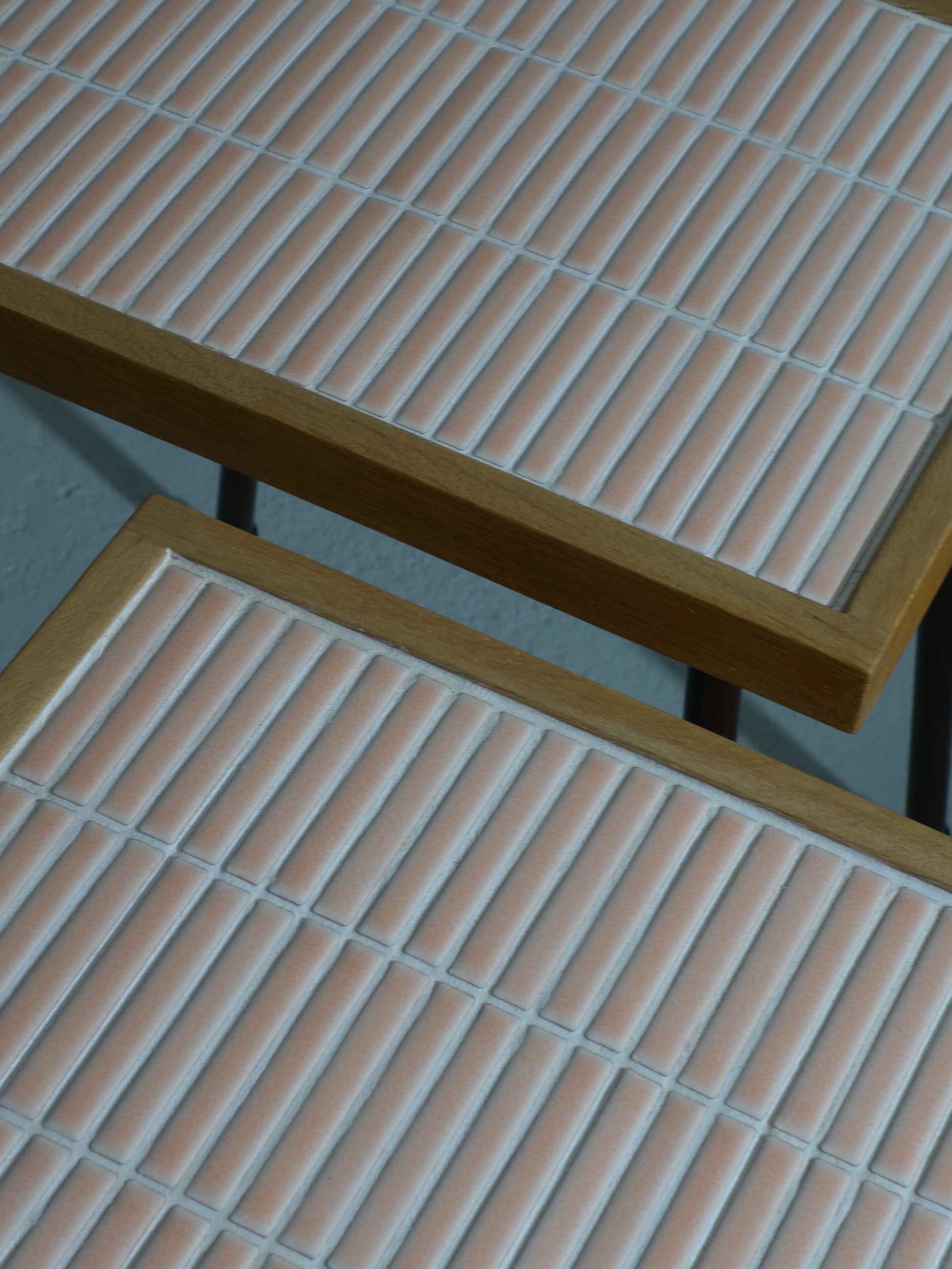 This table has a sleek brown frame with warm peachy pink finger tiles & bright white grout wrapped in buttery oak trim.