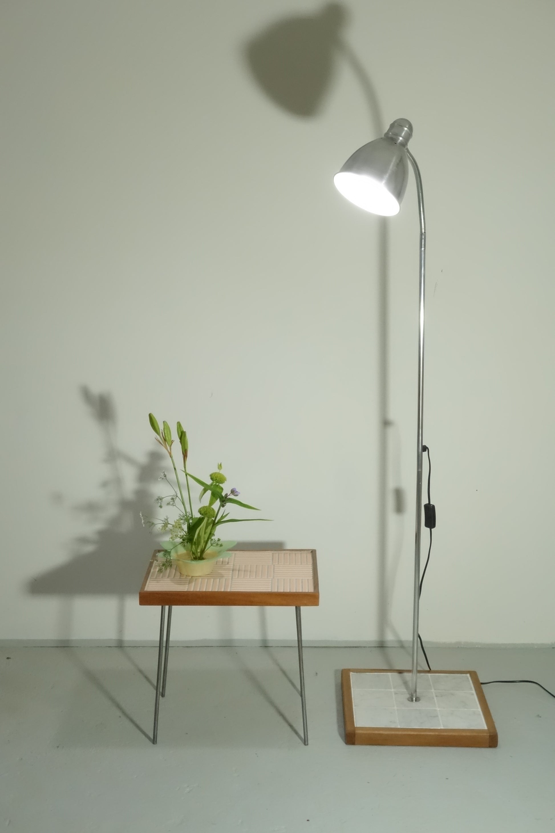 Sleek and understated, this floor lamp blends a polished chrome metal frame with a crisp white quartz tile base and warm Rimu trim. It’s simple enough to fit anywhere, yet stylish enough to catch the eye and give any room a subtle pop