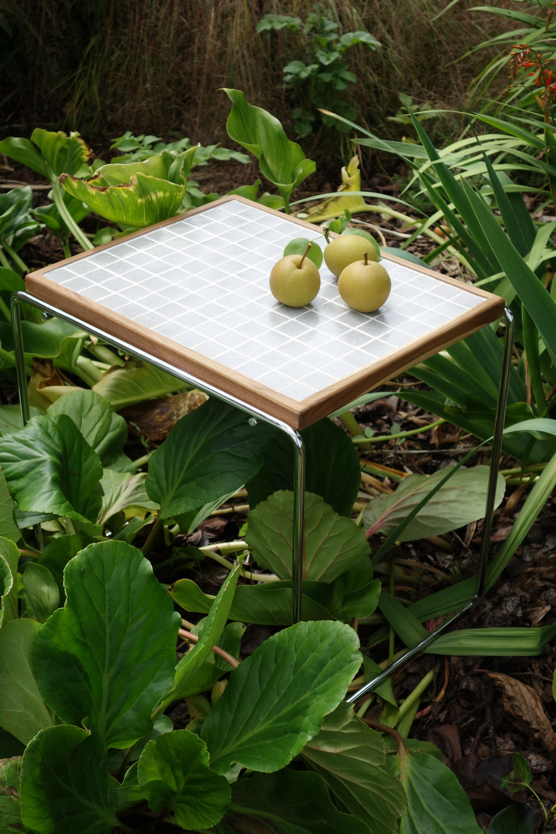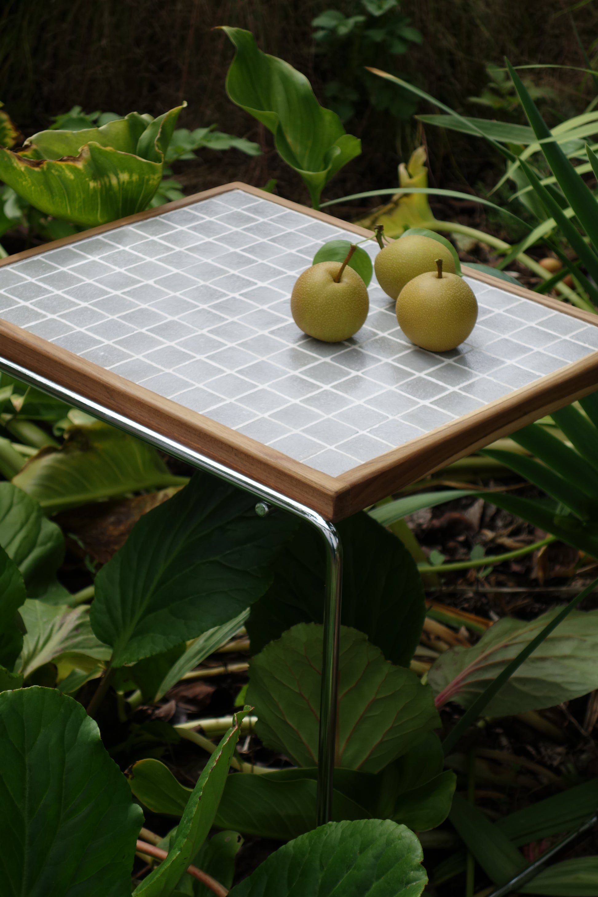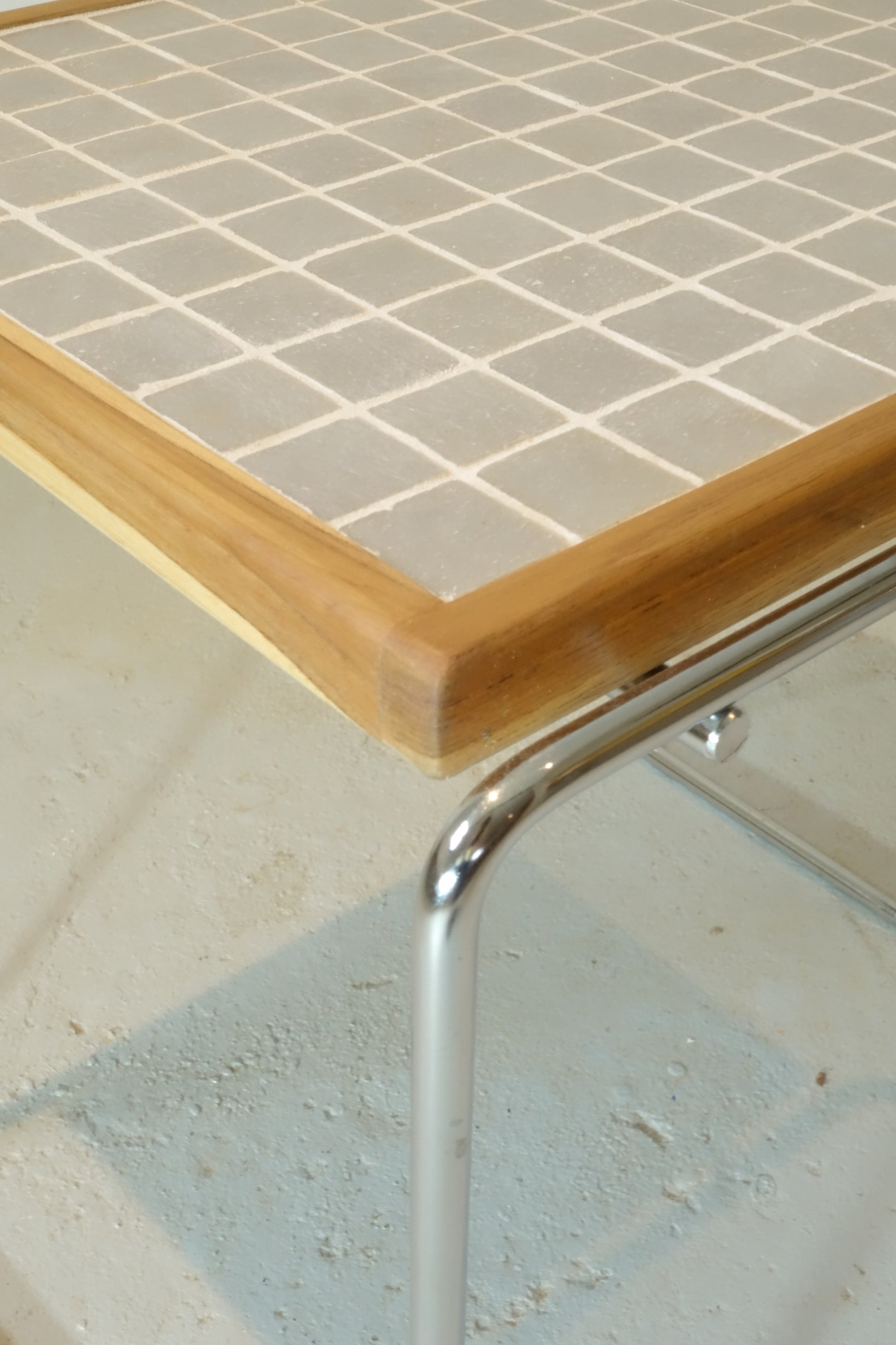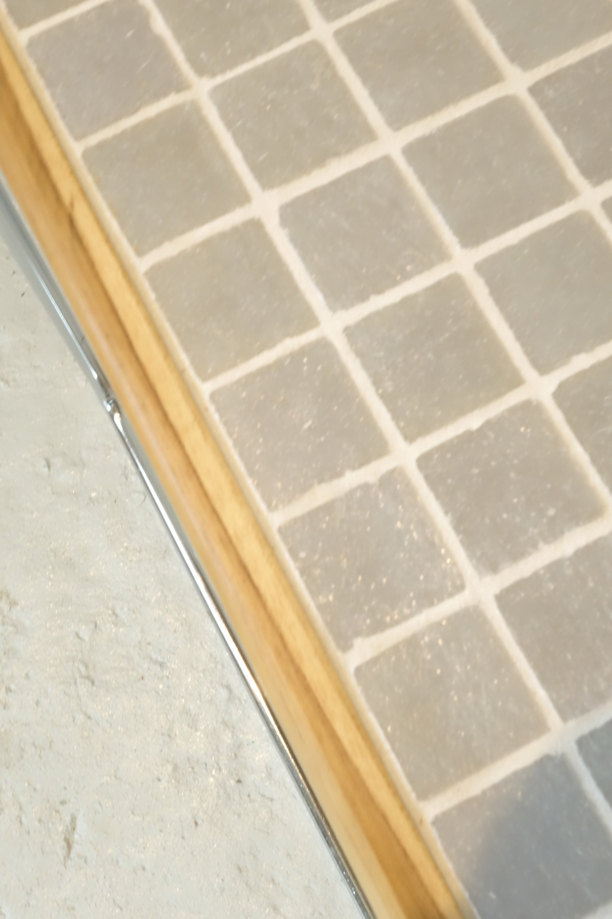 Smokey grey tiles and white grout with teak trim, sitting on a sleek chrome frame. This table top can be taken off a used as a serving platter too!