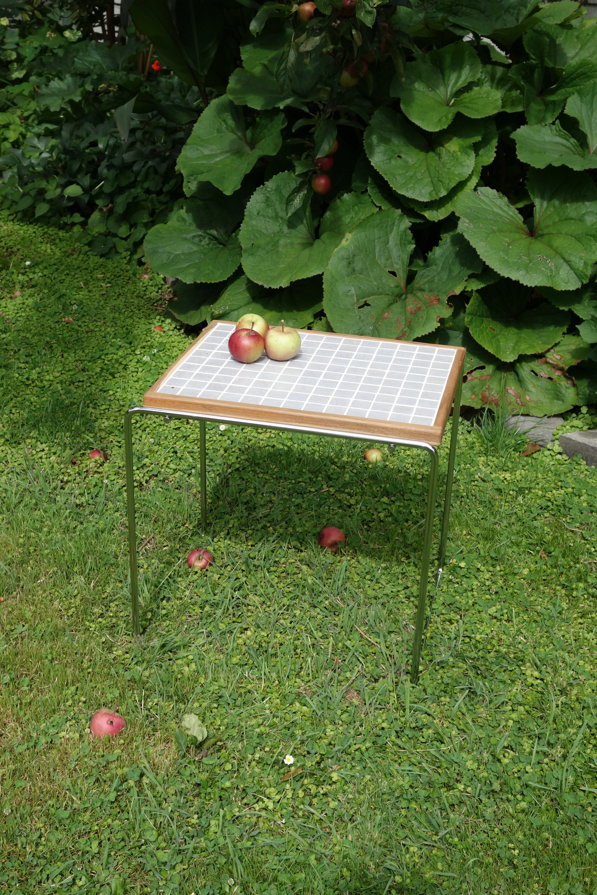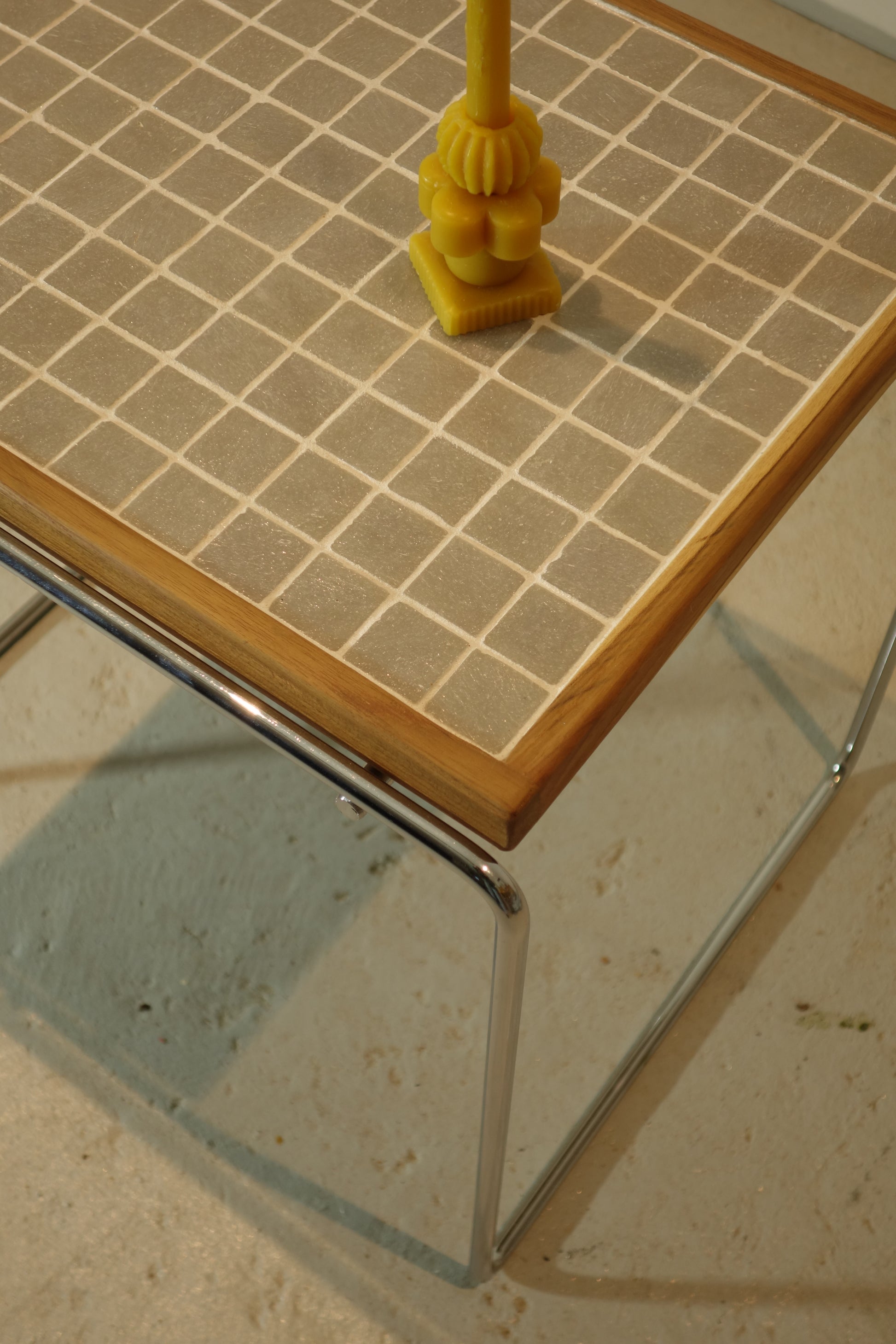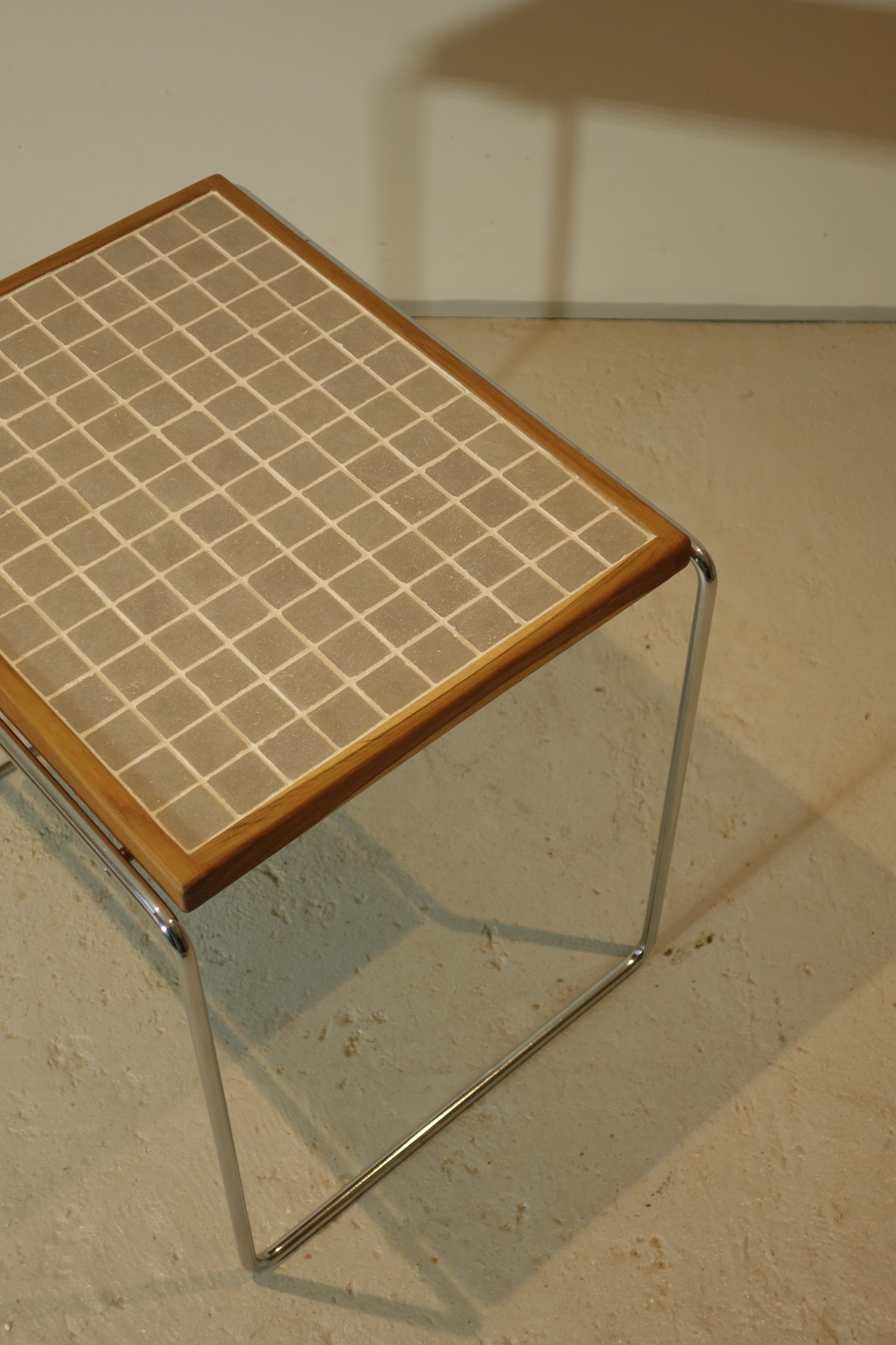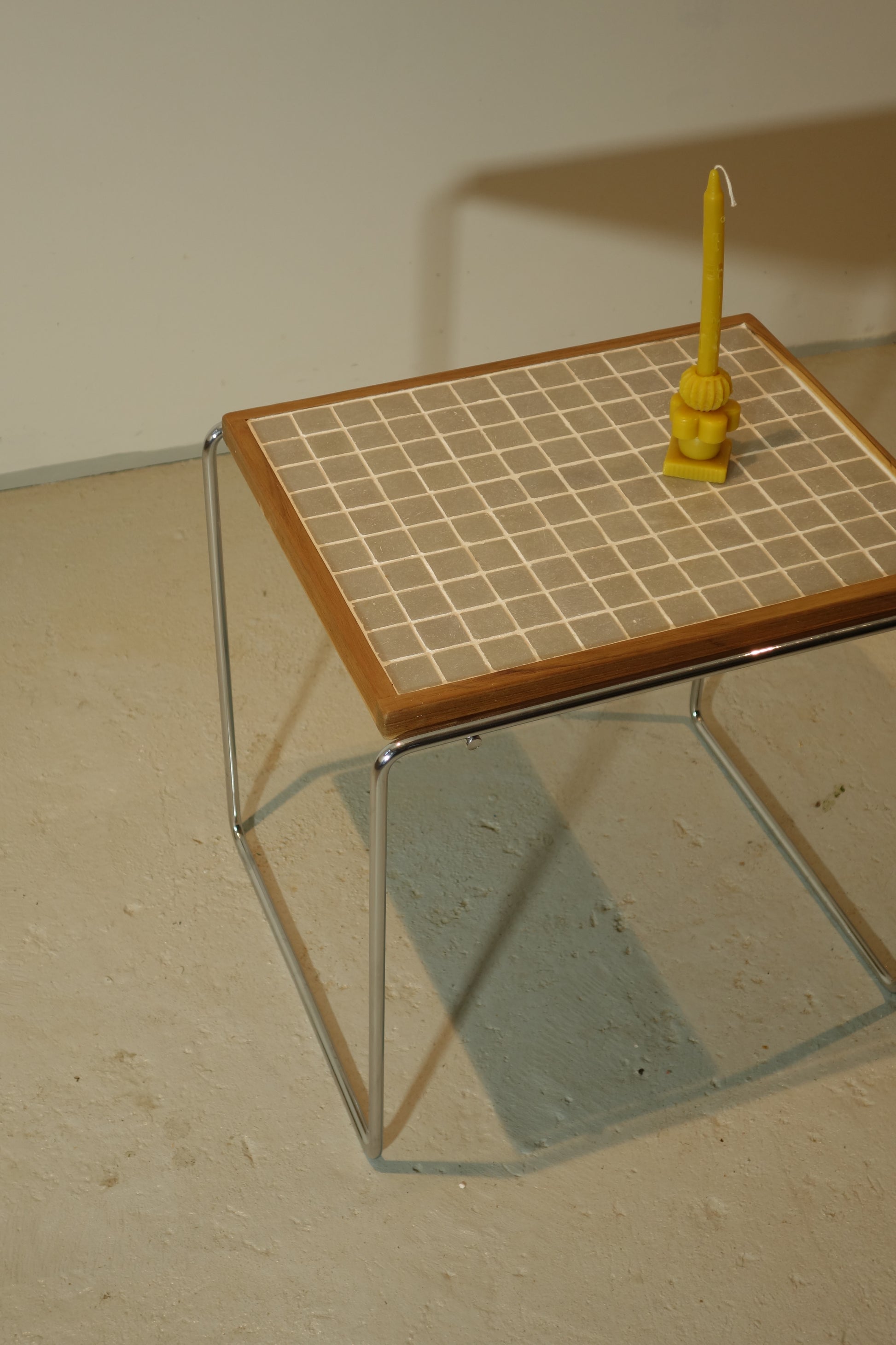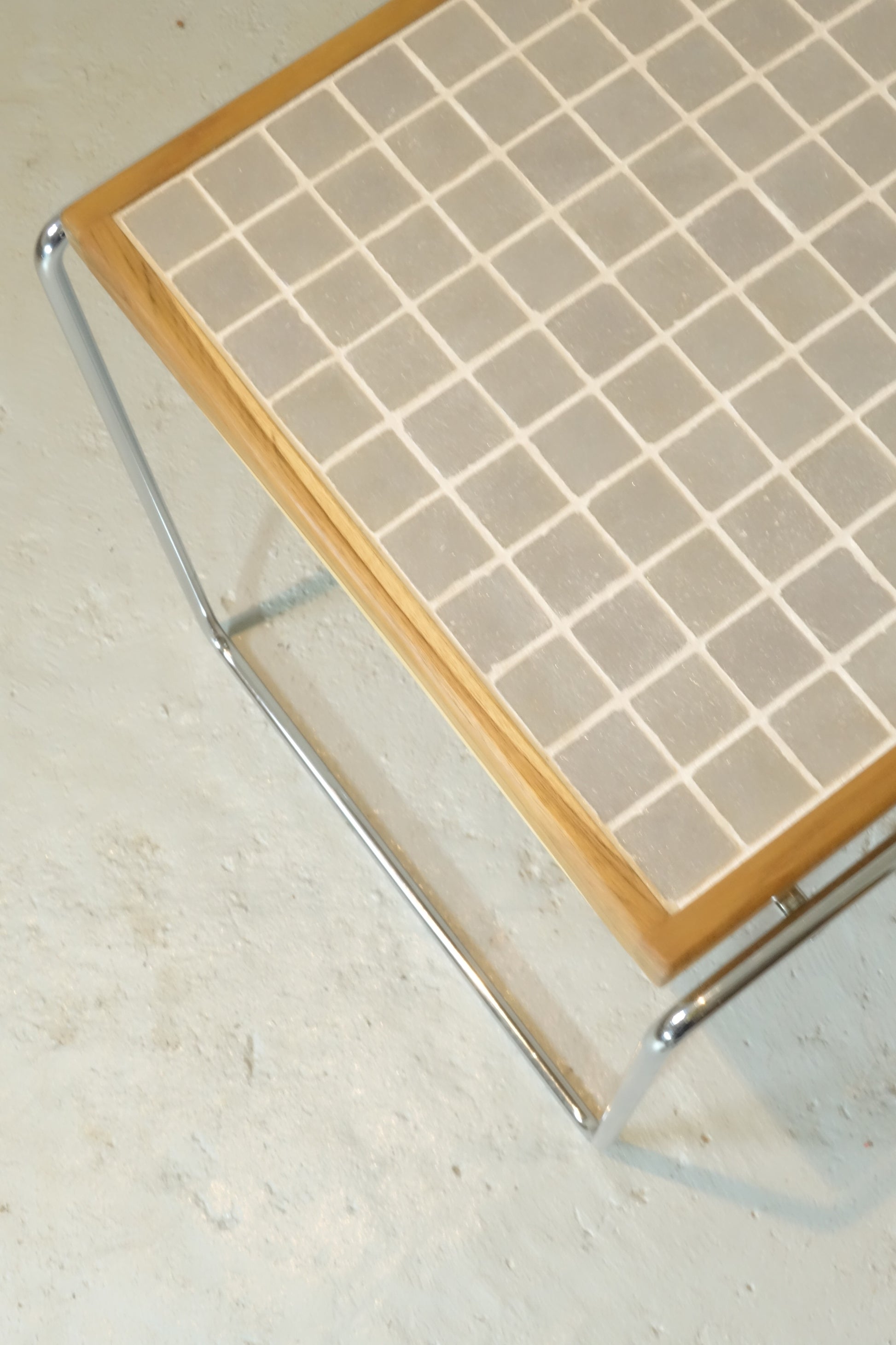 Smokey grey tiles and white grout with teak trim, sitting on a sleek chrome frame. This table top can be taken off a used as a serving platter too!