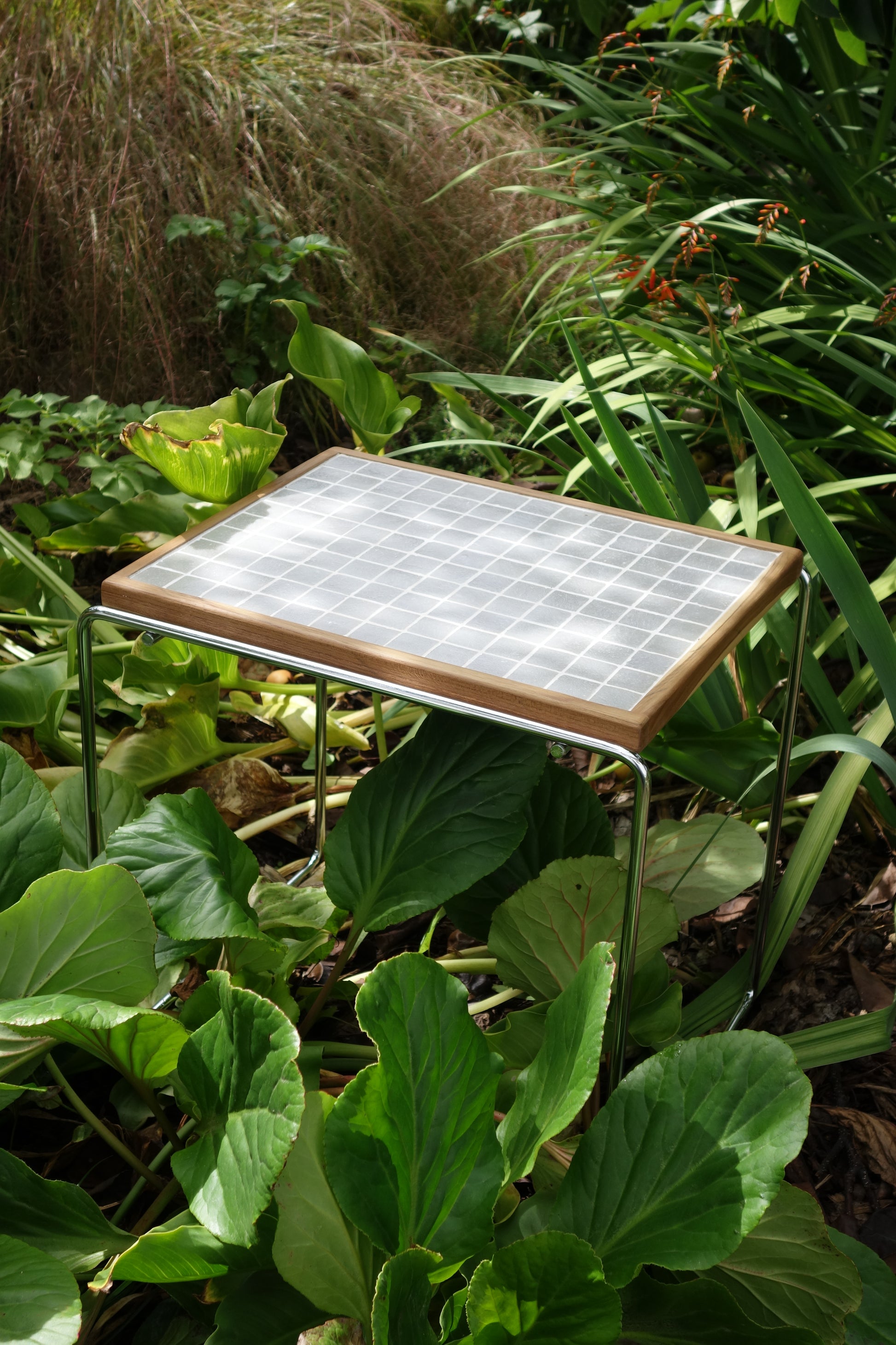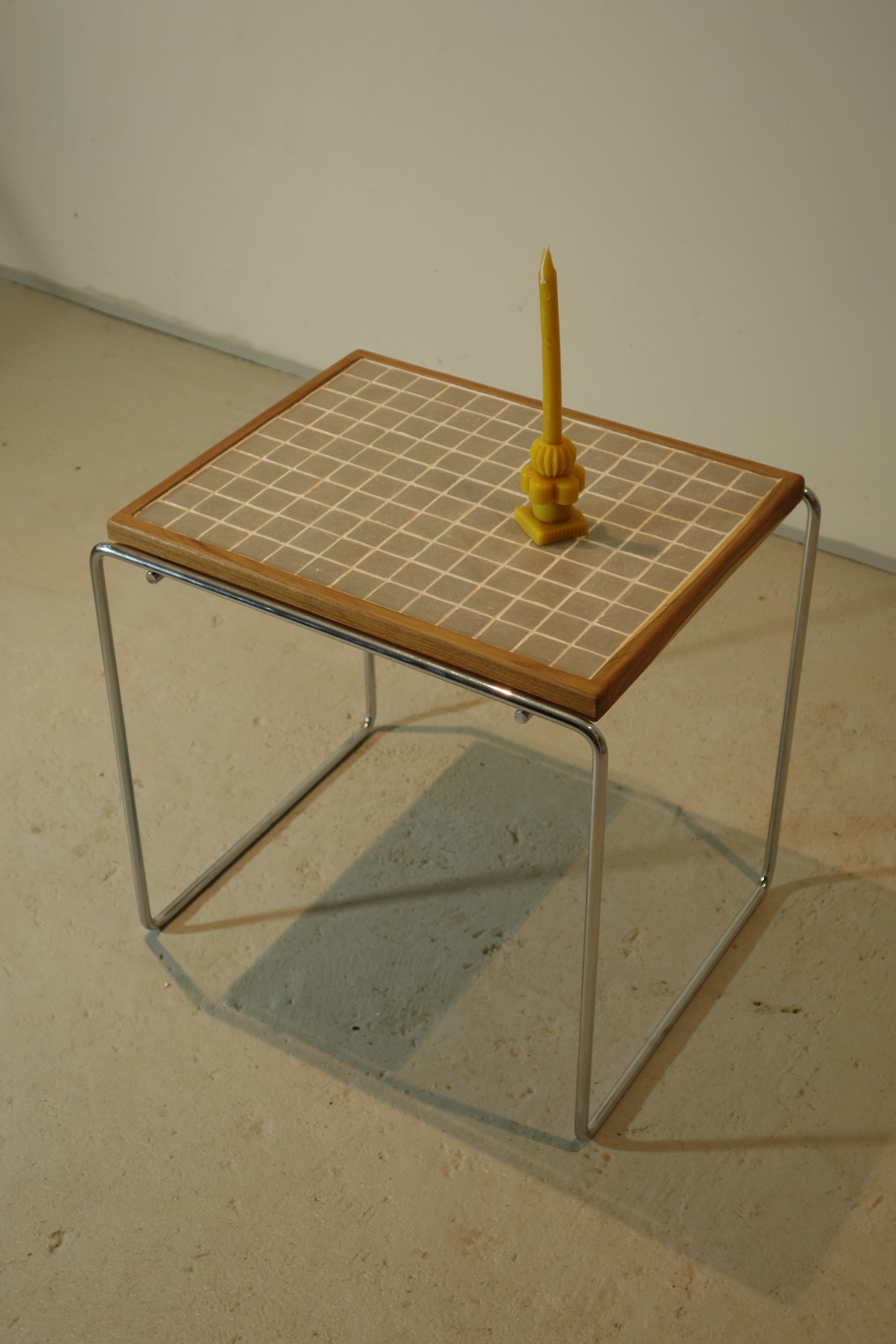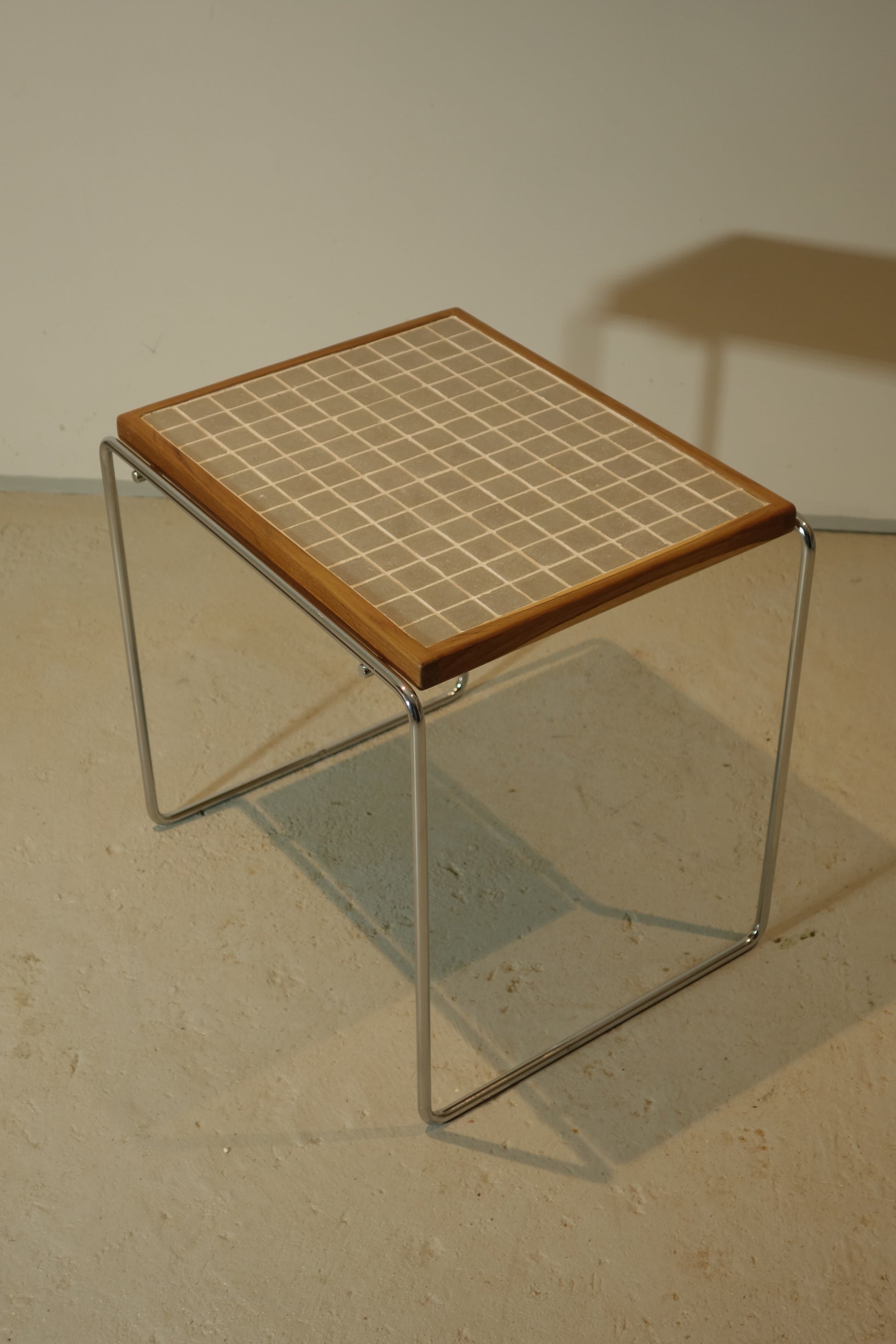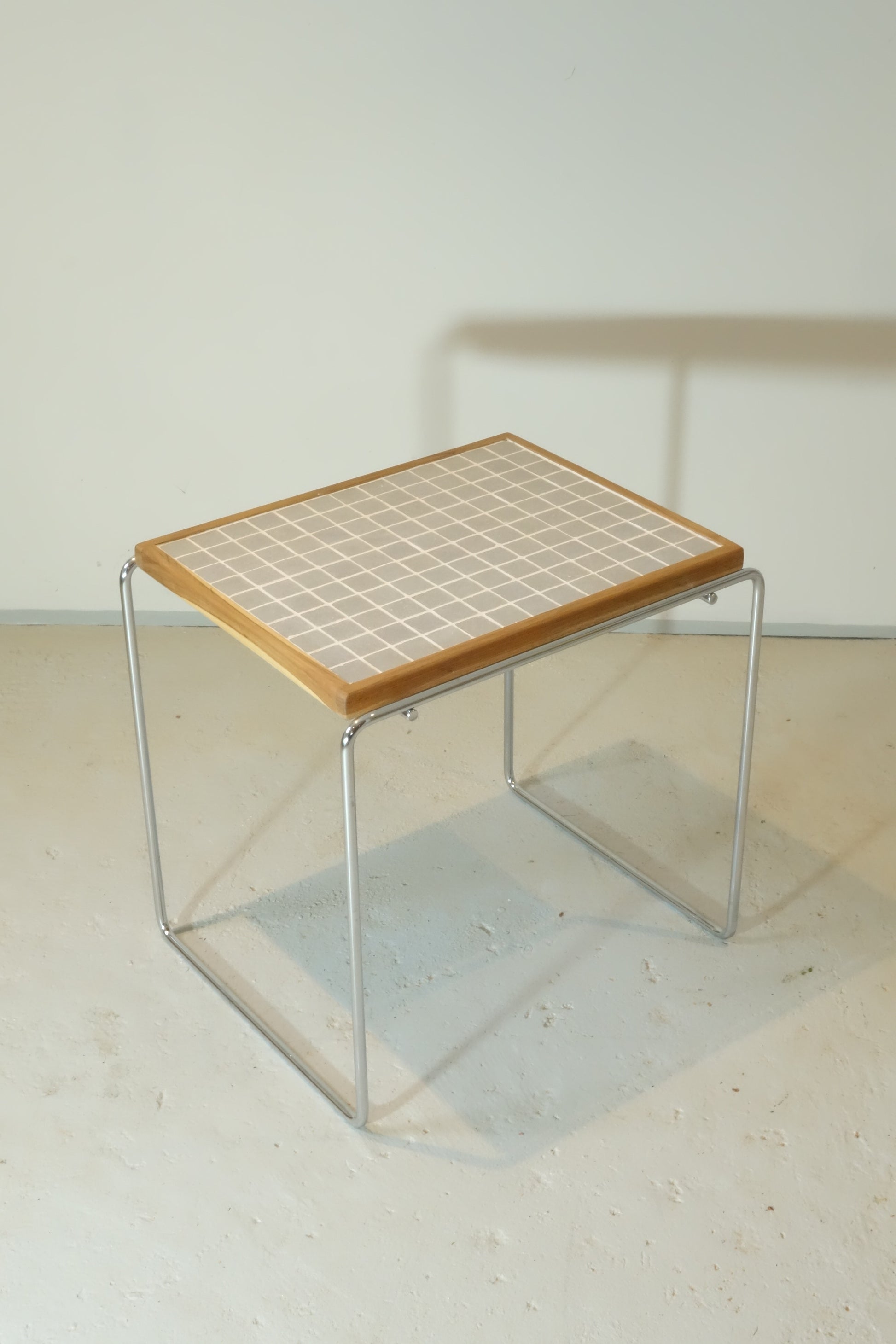 Smokey grey tiles and white grout with teak trim, sitting on a sleek chrome frame. This table top can be taken off a used as a serving platter too!